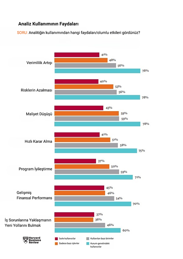Harvard Business Review, “Karar Vermenin Evrimi: Lider Kuruluşlar Veri Odaklı Bir Kültürü Nasıl Geliştiriyor” makalesine göre analiz kullanımının faydaları şöyle listeleniyor: