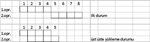 Üst üste yüklemeler (overlapping): Bir makinede üretim başladıktan sonra, iş emri miktarının tümü bitmemiş olsa bile, üretimden çıkanlar, parça parça veya dolan kasalar bir sonraki istasyona gönderilerek ikinci operasyonun başlaması mümkün olur. Bu durumda, çizelgede merdiven basamağı görünümü geçersiz olur, basamaklar kesişir. Aşağıdaki şekilde görülmektedir. Bu yüzden “peş peşe operasyonlarda üst üste yükleme varsa, sonraki operasyon önceki operasyon başlangıç tarihinden, önceki operasyondaki bir kasadaki üretim miktarına denk gelen süre kadar sonra başlar” şeklinde bir tanımlama yapılabilir.