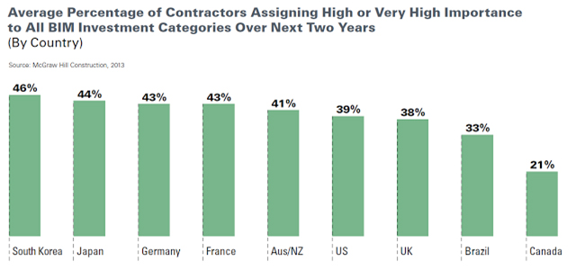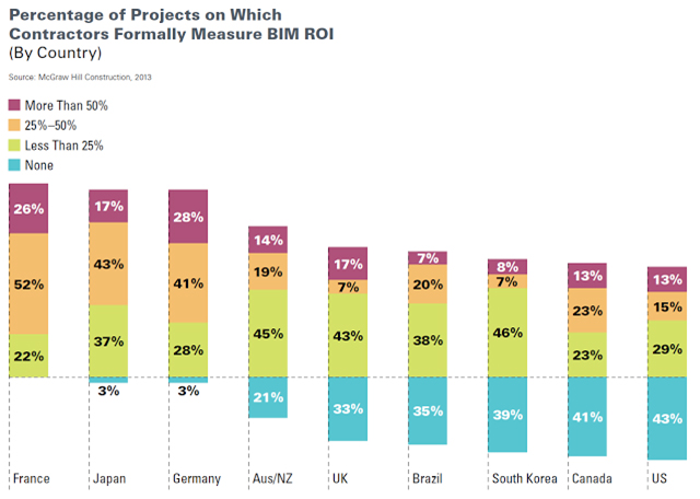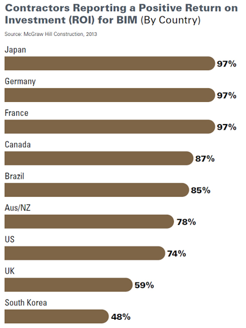 Tüm bu koşullara rağmen,yukarıdaki grafiğin ülkeler bazında gösterdiği gibi müteahhitler BIM yatırımlarının pozitif geri dönüşü olduğunu düşünüyorlar.
